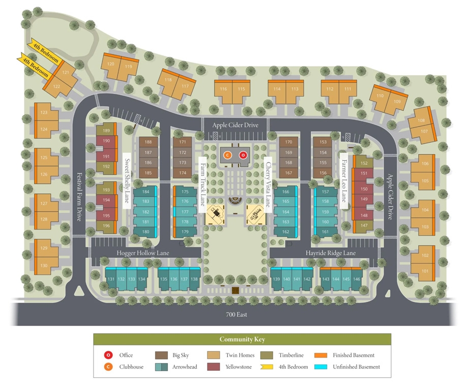 - This agriculture-inspired community offers charming amenities as well as a mix of townhomes and duplexes with up to 4 bedrooms.